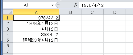 下図のA1:A5セルには 1978/4/12 と日付型のデータが入力されています。