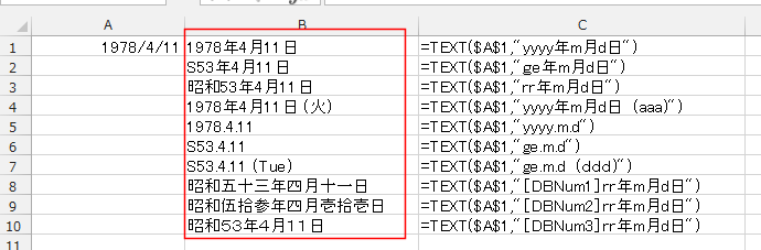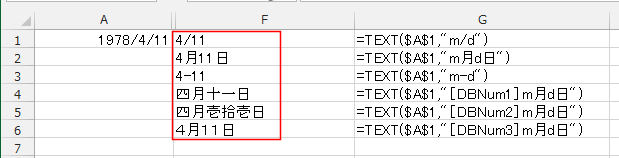 - これらの表示形式で表現できる日付の文字列は TEXT関数を使って文字列に変換することができます。