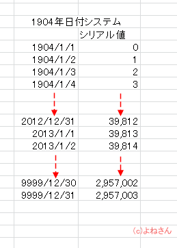 - 1904年日付システム(Macintosh版Excelの標準)では1904年1月2日を1として、1日経過ごとに+1した数値になります。