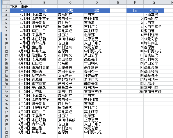 - まず表示する当番の人のリストはG3:G22に書き出してあります。