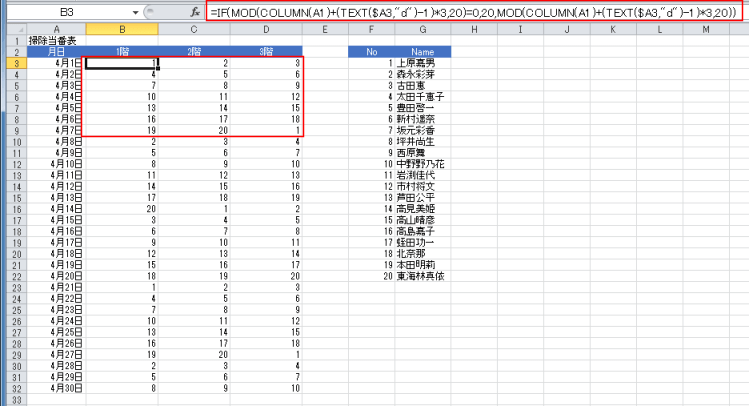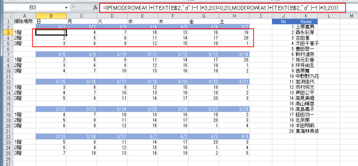 - =IF(MOD(ROW(A1)+(TEXT(B$2,"d")-1)*3,20)=0,20,MOD(ROW(A1)+(TEXT(B$2,"d")-1)*3,20))で下図のような連番を作成することができました。