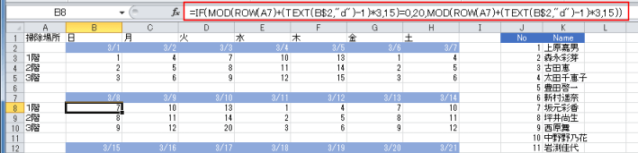 第2週目は =IF(MOD(ROW(A7)+(TEXT(B$2,"d")-1)*3,15)=0,15,MOD(ROW(A7)+(TEXT(B$2,"d")-1)*3,15)) と7始まりにする必要があります。