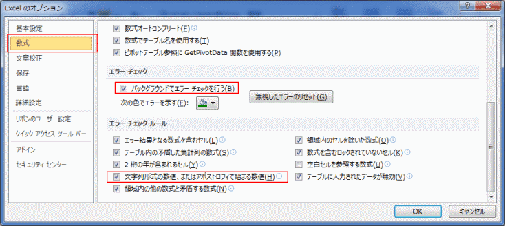 - [数式]を選択し、「バックグラウンドでエラーチェックを行う」にチェックが入っていると、エラーチェックオプションが表示されます。