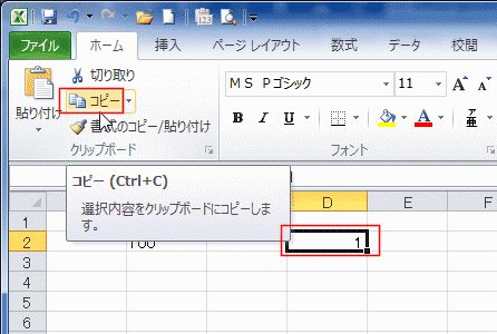 - 空いているセルに「1」と入力し、ホームタブのコピーを実行します。