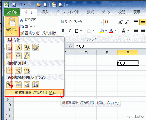 - 文字列の数字が入力されているセルを選択して、[ホーム]タブの[貼り付け]→[形式を選択して貼り付け]を実行します。