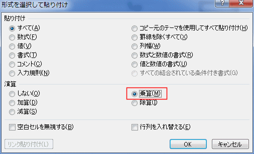 - 「乗算」にチェックを入れて[OK]ボタンをクリックします。