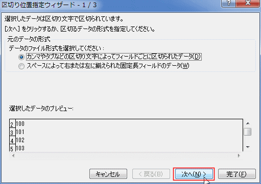 - 区切り位置指定ウィザード1/3 が表示されます。そのまま[次へ]ボタンをクリックします。