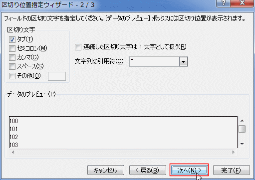 - 区切り位置指定ウィザード2/3 が表示されます。そのまま[次へ]ボタンをクリックします。
