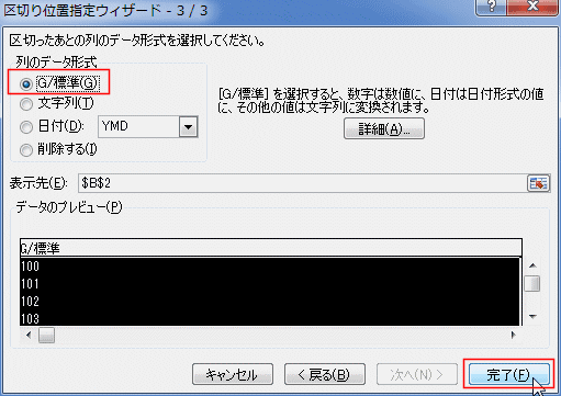 - 区切り位置指定ウィザード3/3 が表示されます。「G/標準」にチェックが入っているのを確認して、[完了]ボタンをクリックします。