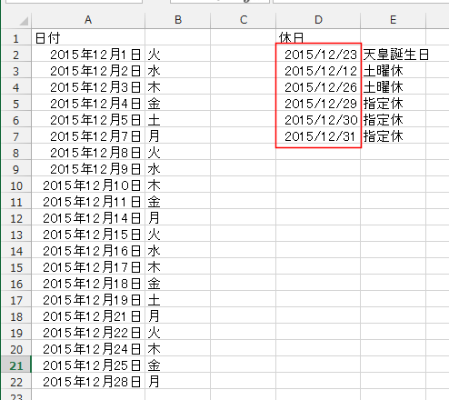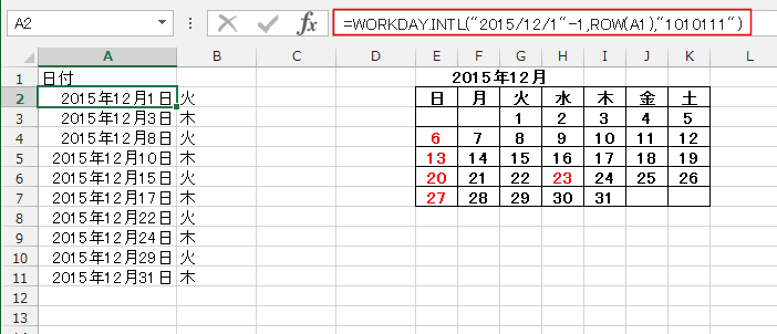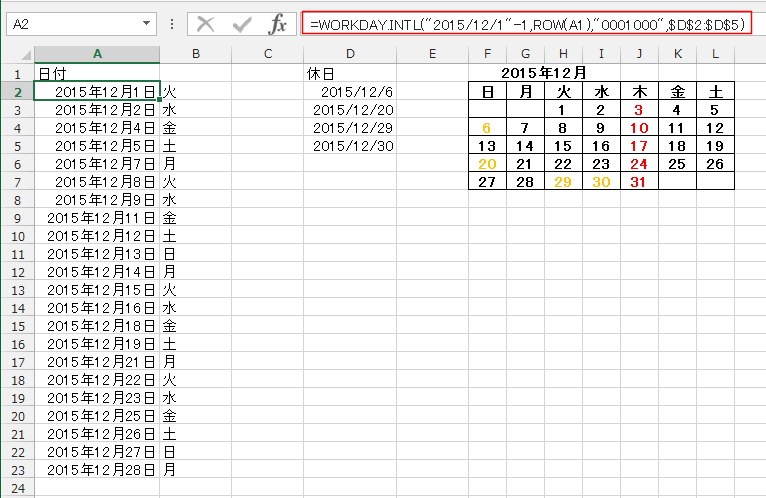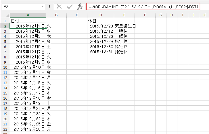 - A2セルに入力した数式は =WORKDAY.INTL("2015/12/1"-1,ROW(A1),11,$D$2:$D$7) としました。