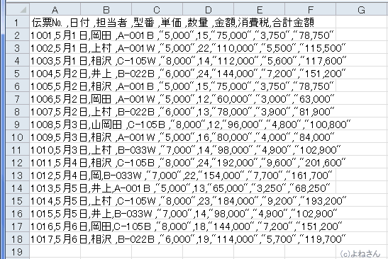 - 「,」(カンマ)で区切られたデータをExcelに貼り付けた状態です。