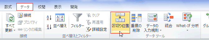 - [データ]タブの「テータツール」グループにある[区切り位置]を実行します。