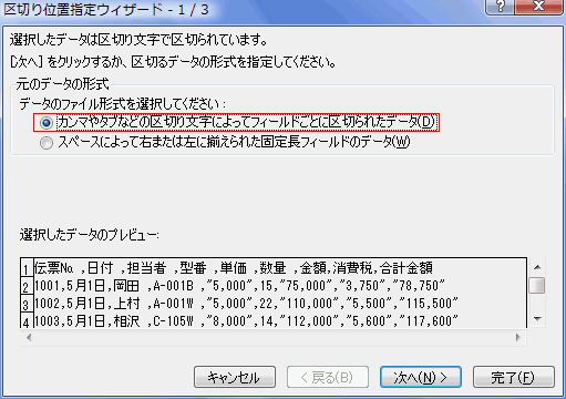- 区切り位置指定ウィザードの1/3で「カンマやタブなどのフィールドごとに区切られたデータ」にチェックを入れます。