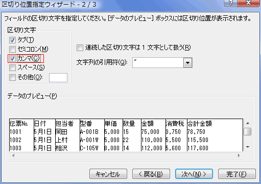 - 区切り位置指定ウィザードの2/3で区切り文字の「カンマ」にチェックを入れます。