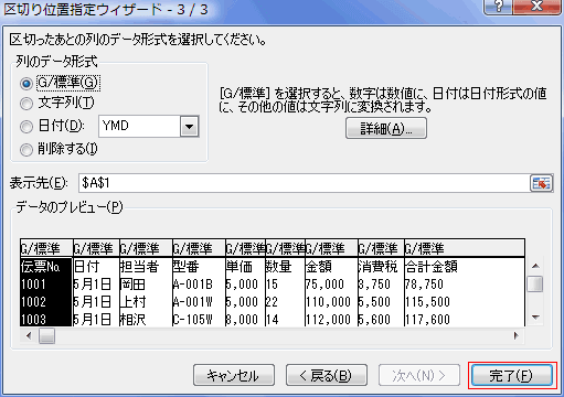 - 区切り位置指定ウィザードの3/3でデータ形式や表示先を指定できますが、この例ではそのままで[完了]ボタンをクリックします。