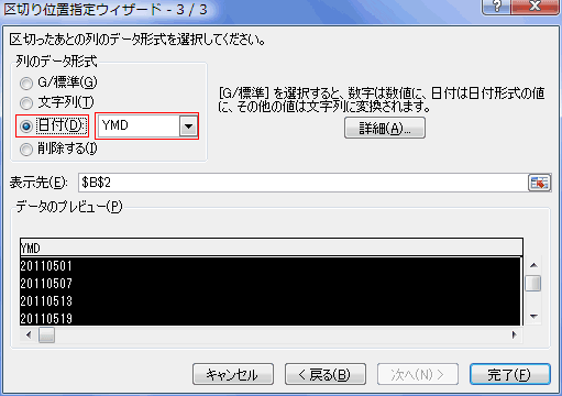 - 区切り位置指定ウィザードの3/3で「日付」にチェックを入れます。横のドロップダウンリストで「YMD」を選択します。
