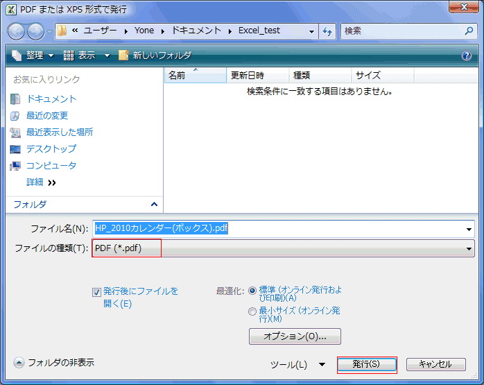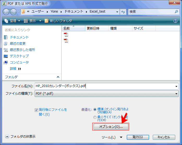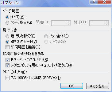 - [PDFまたはXPS形式で発行]ダイアログ または[名前を付けて保存]ダイアログの[オプション]ボタンで設定が変更できます。