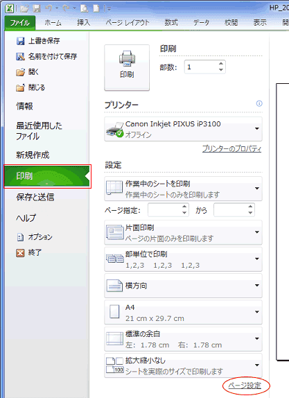 - ページ設定は[ファイル]タブの[印刷]からも実行できます。
