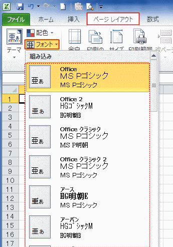 - 「ページレイアウト」タブの「テーマ」グループにある「フォント」をクリックすると、リストで表示されます。