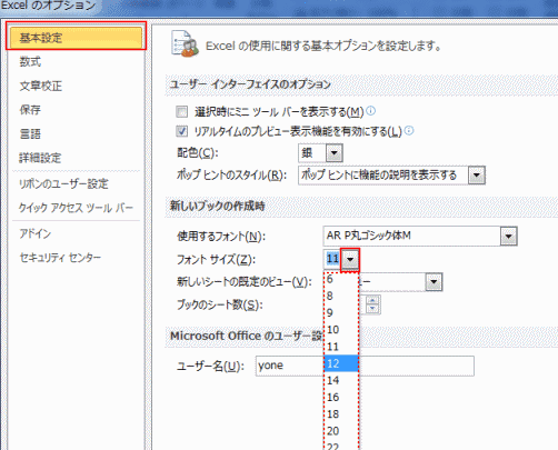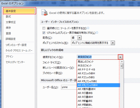 - Excel2010を起動したときに使用するフォントやフォントサイズを変更します。