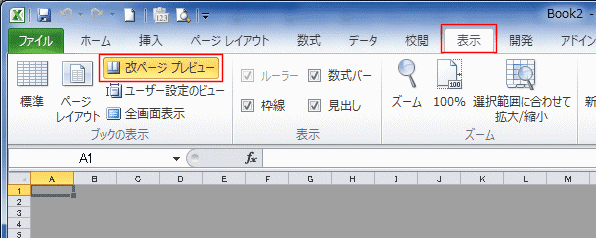 - [表示]タブを選択すると「ブックの表示」グループの[改ページプレビュー]がオンの状態になっていました。