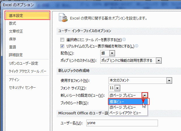 - [基本設定]を選択し、新しいブックの作成時の新しいシートの既定のビューを「標準ビュー」に設定します。