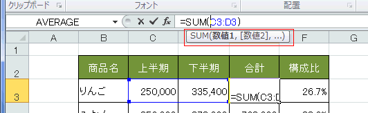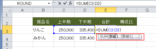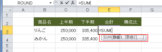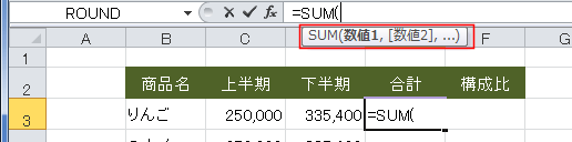 =SUM( と前かっこまで入力すると関数のヒントが表示されます。