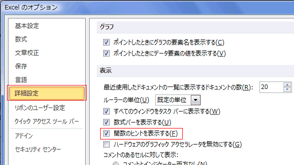 - [詳細設定]の表示で「関数のヒントを表示する」のチェックボックスをON/OFFして設定します。