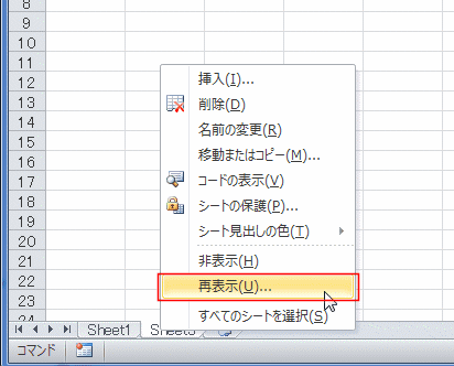 - シート見出しを右クリックし、[再表示]を実行します。