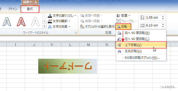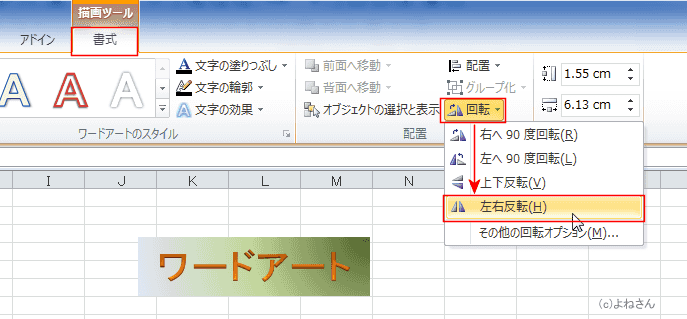 よねさんのExcelとWordの使い方|エクセル2010基本講座:目次|図(写真や画像)や図形の操作|ワードアートの左右反転ができない?