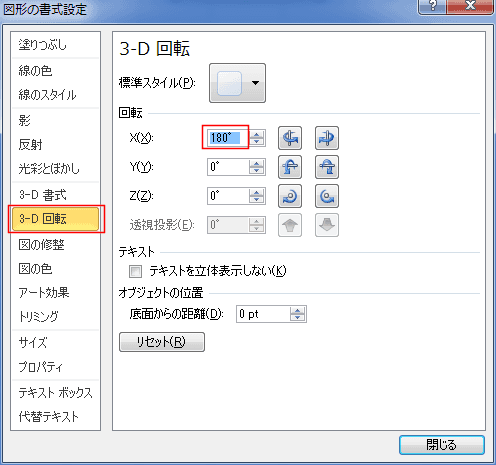- [3-D回転]を選択します。回転のXで「180°」と設定します。