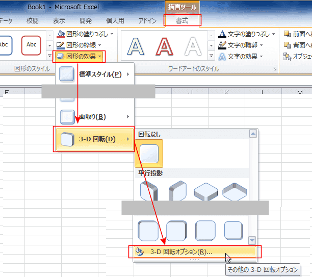 [図形の効果]→[3-D回転]→[3-D 回転オプション]を実行します。