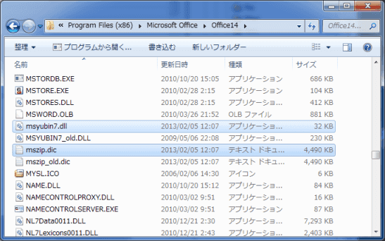 - 下図は Windows7(64bit),Office2010(32bit)の場合で Office15フォルダの msyubin7.dll とmszip.dic を