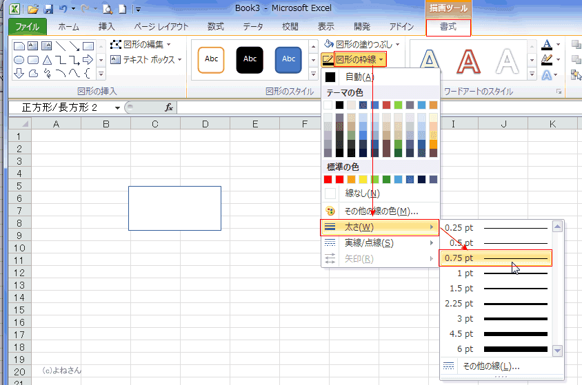 - 「描画ツール」リボンの[書式]タブで[図形の枠線]→[太さ]→「0.75pt」に変更します。