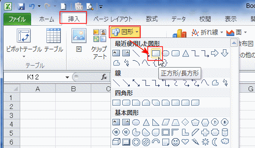 - [挿入]タブの[図形]→[正方形/長方形]を選択しました。