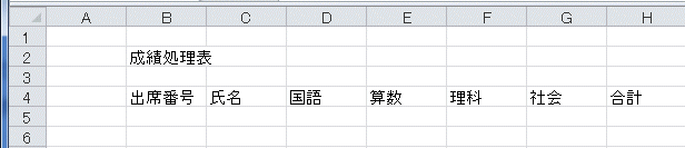 - 以下同様に『氏名』、『国語』、『算数』、『理科』、『社会』と[Tab]キーで移動しながら、入力していきます。