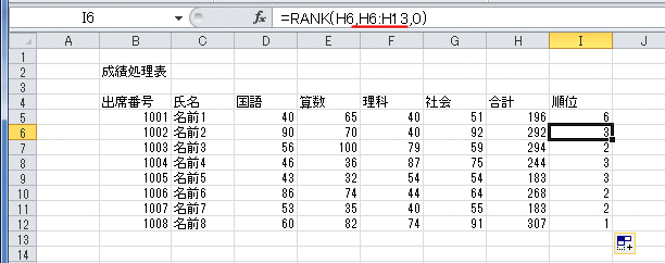 よねさんのExcelとWordの使い方|Excel2010入門編:目次|Excel2010(エクセル2010)入門編:数式で順位を求める(セル参照)
