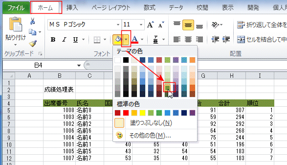 - [ホーム]タブの[塗りつぶしの色]をクリックし、表示されたカラーパレットから色を選択します。