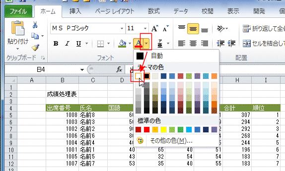- フォントの色を変更するセルを選択します。