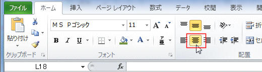 - [ホーム]タブの[中央揃え]をクリックします。