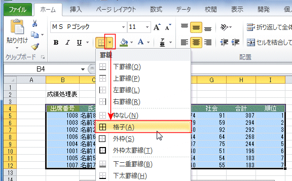 - [ホーム]タブの[罫線]をクリックして、[格子]を選択します。