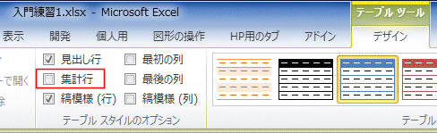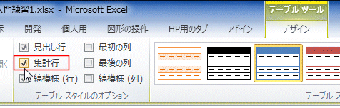 テーブルスタイルのデザイン グループの「集計行」をクリックして、チェックを入れます。