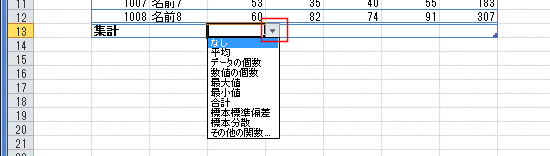 集計行のセルを選択して、どらっプダウンリストを開くと、平均、合計、最大値、最小値などを選択できます。