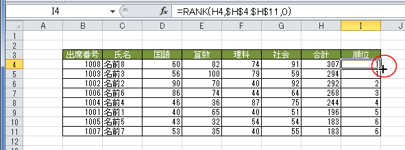 - 数式を修正したI4セルを選択して、フィルハンドルにマウスポインタを重ねます。