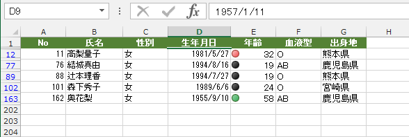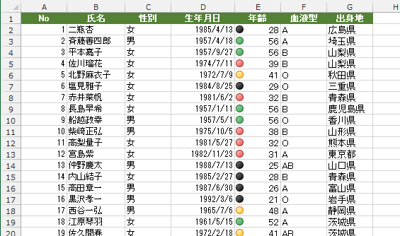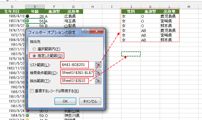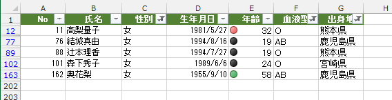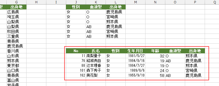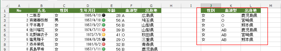 下図のようなデータを使って、性別が「女」、血液型が「O」または「AB」、出身地が「鹿児島県」または「宮崎県」または「熊本県」であるデータを抽出したいと思います。