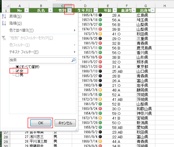 「性別」のフィルターボタンをクリックして、「女」のデータを抽出します。