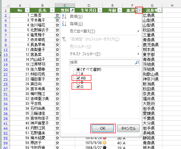 「血液型」のフィルターボタンをクリックして、「AB」と「O」のデータを抽出します。