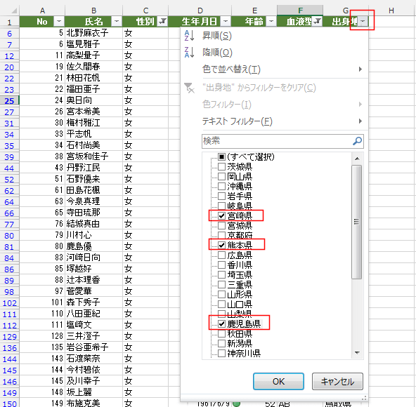 [出身地]のフィルターボタンをクリックして、「宮崎県」と「熊本県」と「鹿児島県」のデータを抽出します。