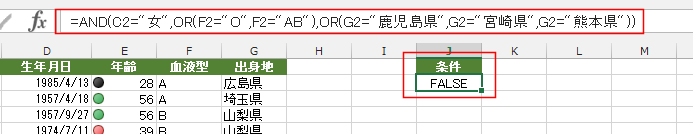 =AND(C2="女",OR(F2="O",F2="AB"),OR(G2="鹿児島県",G2="宮崎県",G2="熊本県"))