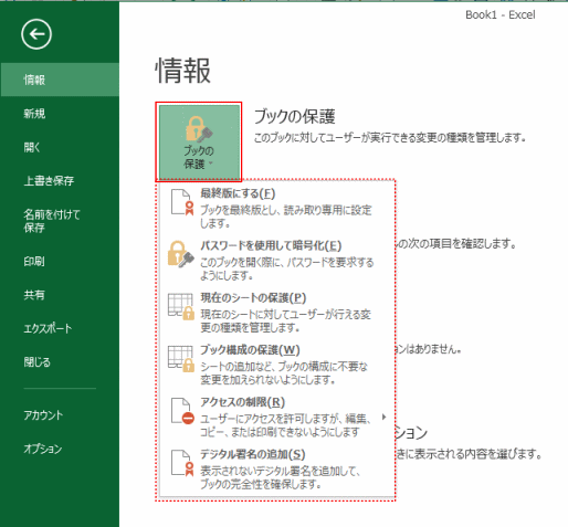 - [情報]タブをクリックすると[ブックの保護]ボタンがありますので、クリックしてメニューを表示します。